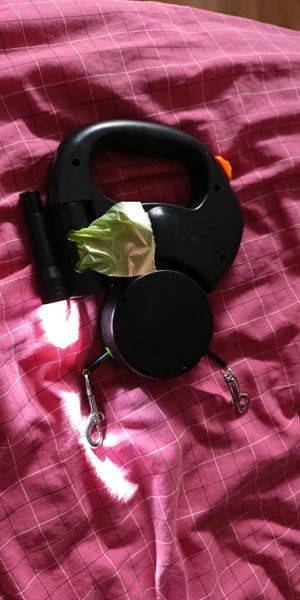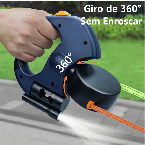 Ao contrário de outros, este modelo une controle independente, lanterna e bolsinho para sacos em um único guia retrátil, oferecendo praticidade, segurança e menos bagunça nos passeios.