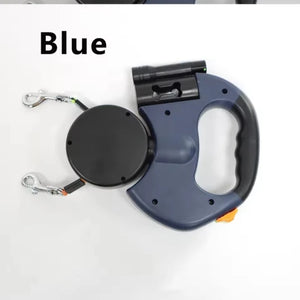 Guia retrátil automática permite segurar duas coleiras em uma mão. Controle independente das cordas evita nós e facilita passeios tranquilos mesmo com cães ativos e puxadores.