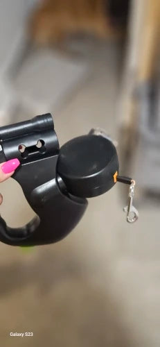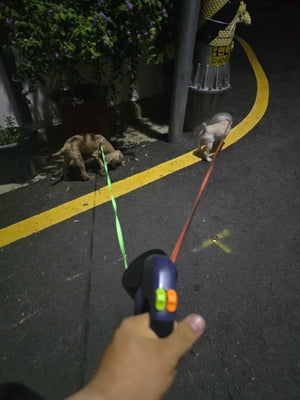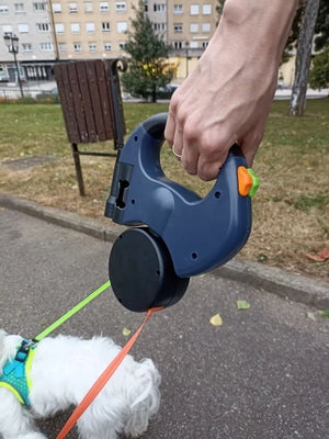Material resistente, pega confortável na mão e o mecanismo retrátil evita nós quando os cães se cruzam.